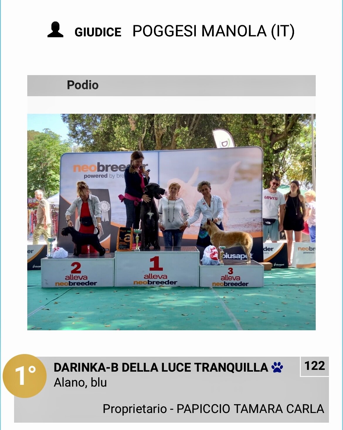 DARINKA DELLA LUCE TRANQUILLA: 1 Ecc JCac + JBOB + BOB + 3° BIS Giovani + 4° BIS Assoluto, dalla classe giovani femmine blu